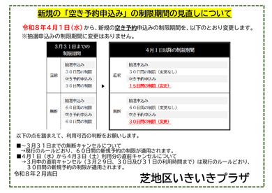令和8年4月1日(水)から、新規の空き予約申込みの制限期間が変更となります。(※抽選申込みの制限期間には変更はありません。)