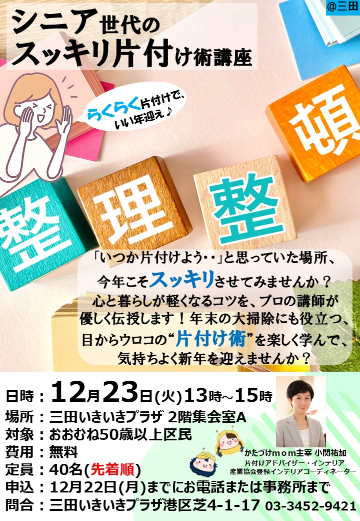 「らくらく片付けでいい年迎え♪シニア世代のスッキリ片付け術講座」を開催します!