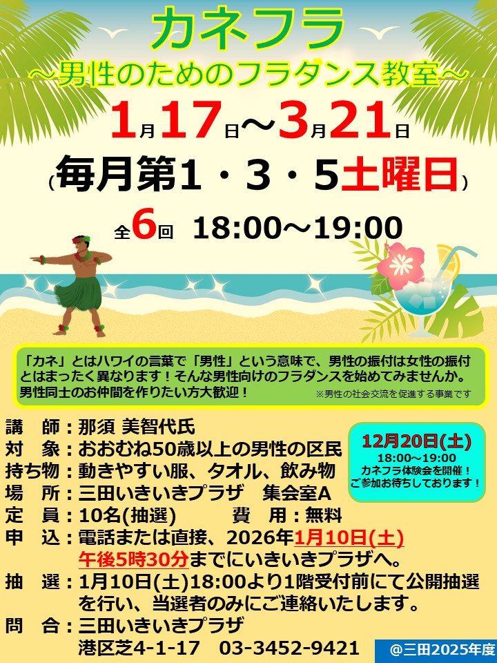 来る翌1月から始まる「カネフラ~男性のためのフラダンス教室~」の参加者を募集いたします!