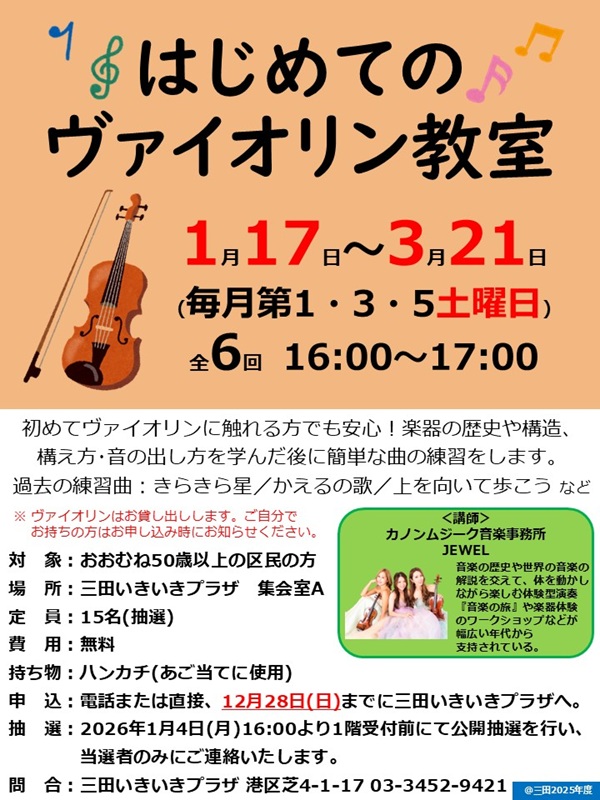 来る翌1月17日(土)より三田いきいきプラザにて「はじめてのヴァイオリン教室」