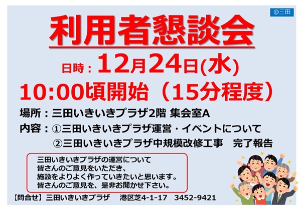 12月24日(水)午前10時より三田いきいきプラザにて、利用者懇談会を開催いたします。