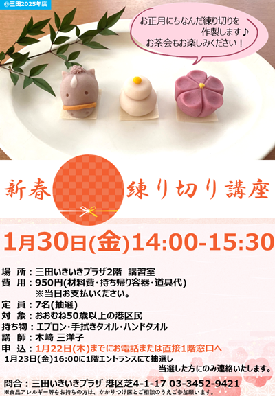 三田いきいきプラザでは、来る1月30日(金)に「新春 練り切り講座」を開催いたします♪