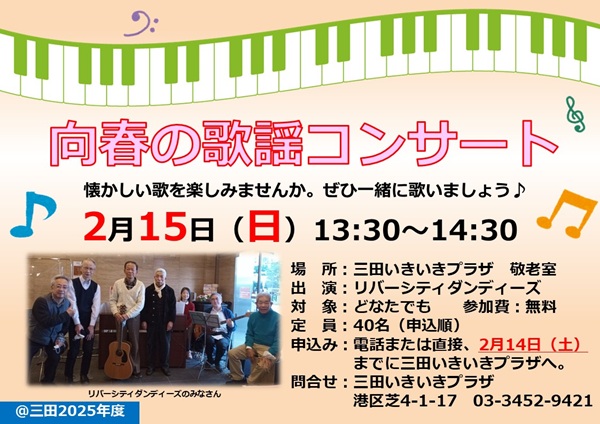 来る2月15日(日)、三田いきいきプラザにて「向春の歌謡コンサート」を開催いたします♪