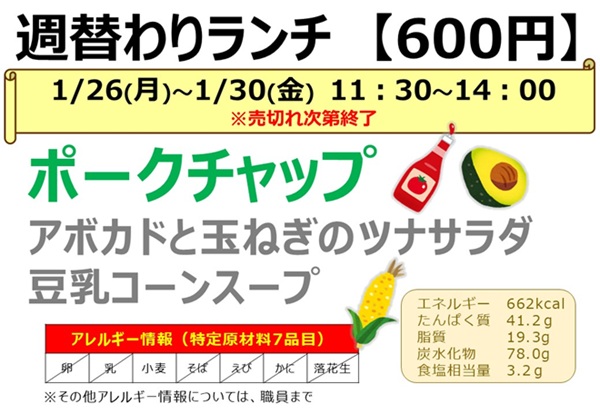 ★1月26日(月)~1月30日(金)今週の週替わりランチのお知らせ★