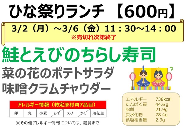 ★3月2日(月)~3月6日(金)今週の週替わりランチのお知らせ★