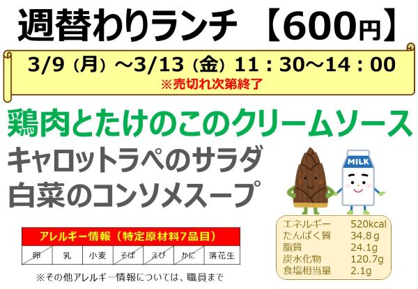 ★3月9日(月)~3月13日(金)今週の週替わりランチのお知らせ★