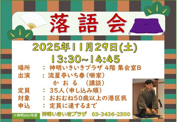 さて、そんな状況を吹き飛ばすべく、11月29日(土)、神明いきいきプラザでは落語会を開催いたします!
