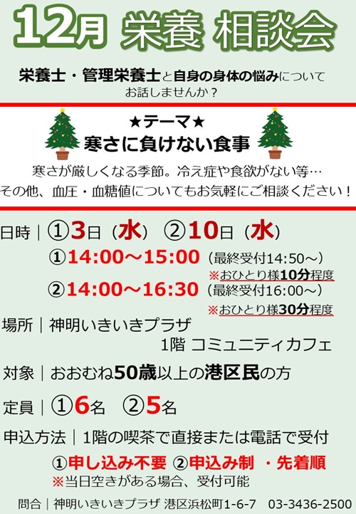 芝地区いきいきプラザ http://shiba-ikiiki.com/ Thu, 27 Nov 2025 10:19:45 +0900 ja-JP Thu, 27 Nov 2025 10:19:45 +0900 Blog コミュニティカフェから12月の栄養相談会のお知らせです https://shiba-ikiiki.com/shinmei/news/details.php?ne_id=3537