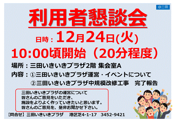 12月24日(火)午前10時より三田いきいきプラザにて、利用者懇談会を開催いたします。
