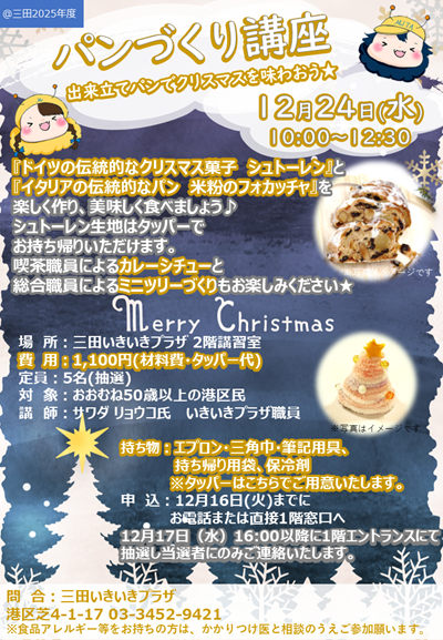 パンづくり講座「出来立てパンでクリスマスを味わおう★」を開催します♪ https://shiba-ikiiki.com/mita/news/details.php?ne_id=3564 皆様、いかがお過ごしでしょうか。
