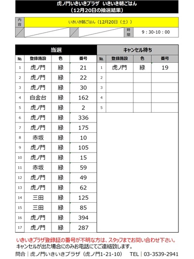 12月20日(土)いきいき朝ごはん「抽選結果のお知らせ」 https://shiba-ikiiki.com/toranomon/news/details.php?ne_id=3568 12月20日(土)いきいき朝ごはんの抽選結果をお知らせいたします。