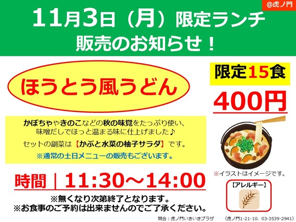 虎ノ門いきいきプラザ http://shiba-ikiiki.com/toranomon/ Wed, 29 Oct 2025 10:50:17 +0900 ja-JP Wed, 29 Oct 2025 10:50:17 +0900 Blog 11月3日(月)祝日限定ランチセット販売のお知らせ! https://shiba-ikiiki.com/toranomon/news/details.php?ne_id=3489
