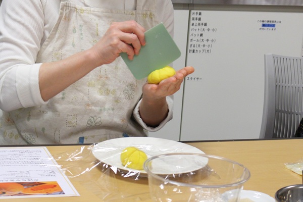 生地を伸ばして、丸めたかぼちゃペーストと白あんを包み、スケッパーで模様を付けました。