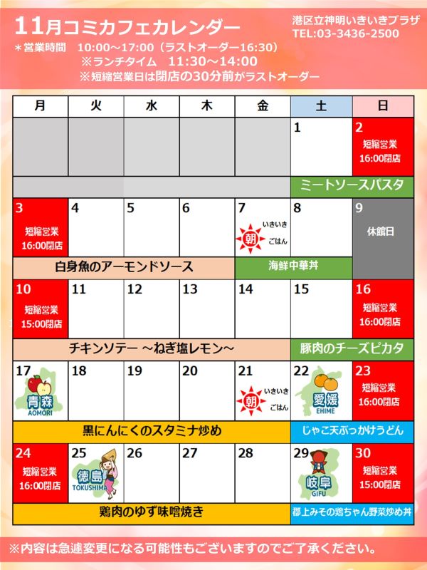 神明いきいきプラザ コミュニティカフェから11月のランチメニューのお知らせです!