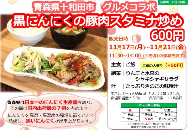 平日は、青森県十和田市の特産品である黒にんにくを使用した、