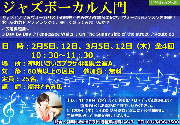 神明いきいきプラザでは2月5日(木)・12日(木) 3月5日(木)・12日(木)の全4回で「ジャズボーカル入門」を開催します♪