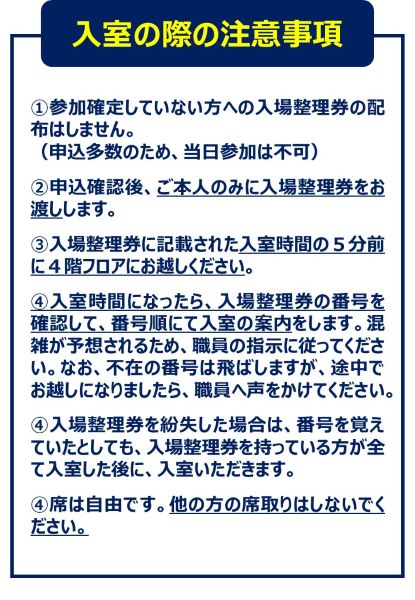 講話会場への入室は、整理券の番号順にてご案内します。