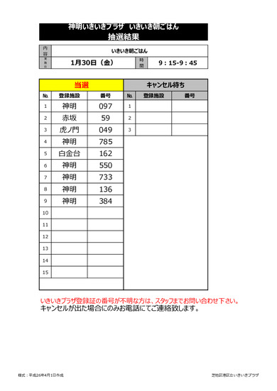 1月30日(金)いきいき朝ごはんの抽選結果をお知らせいたします。
