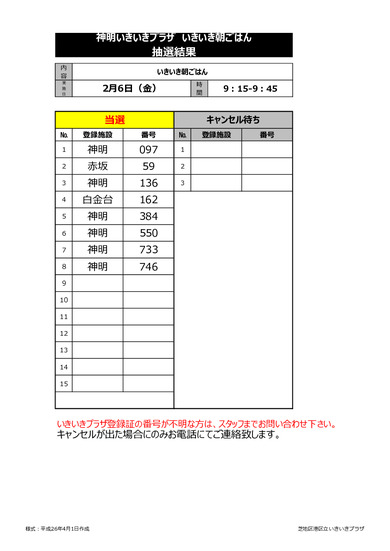 2月6日(金)いきいき朝ごはんの抽選結果をお知らせいたします。