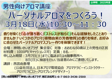 さて、神明いきいきプラザでは3月18日(水)に「男性向けアロマ講座 パーソナルアロマをつくろう!」を開催いたします♪