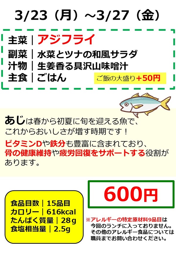 今週のランチは、アジフライがメインとなっているランチです!