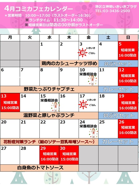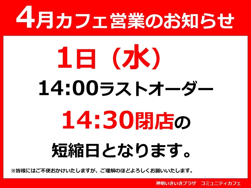 コミュニティカフェから4月カレンダーと短縮営業日のお知らせです♩
