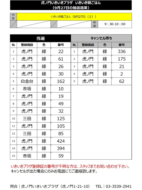 9月27日(土)いきいき朝ごはん「抽選結果のお知らせ」