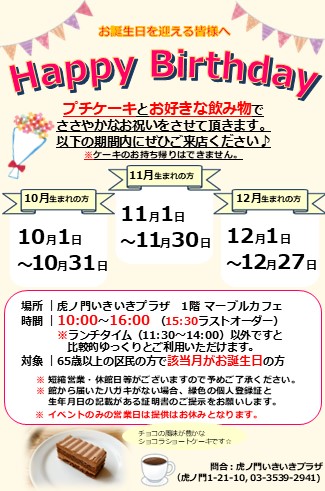 65歳以上の区民の方を対象に、お誕生月に限りプチケーキとお好きなお飲み物で