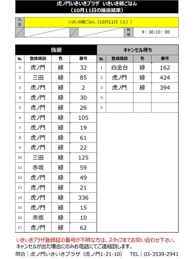 10月11日(土)いきいき朝ごはんの抽選結果をお知らせいたします。