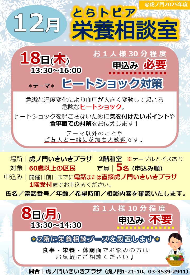 12月8日(月)18日(木)「とらトピア栄養相談室」を開催いたします
