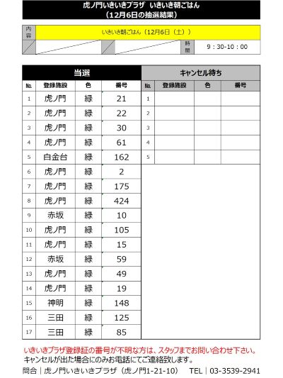 12月6日(土)いきいき朝ごはんの抽選結果をお知らせいたします。