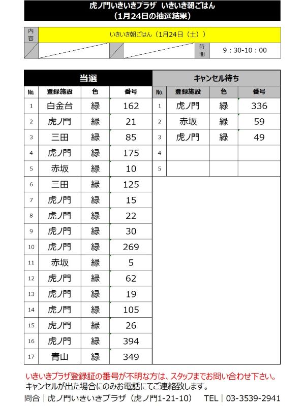 虎ノ門いきいきプラザまで当落の結果をお問い合わせください。