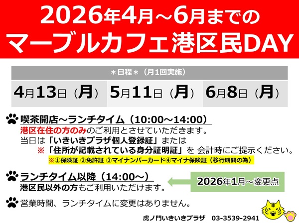 4月13日(月)、【マーブルカフェ港区民DAY】を実施いたします。